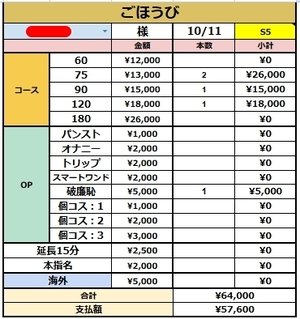 4名様接客頂いて¥57,600円です(*´ω`*)