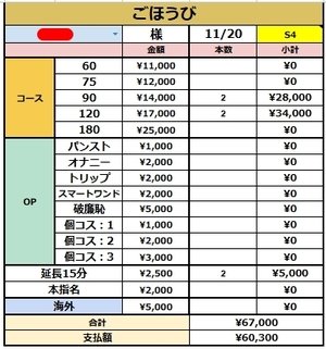 4名様接客頂いて¥60,300円です(*´ω`*)