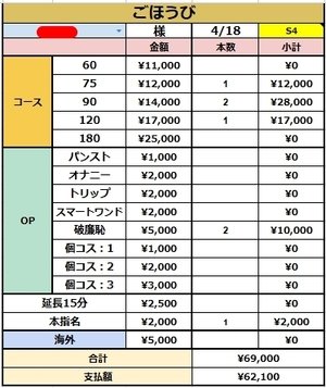 4名様接客頂いて¥62,100円です(*´ω`*)