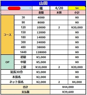 2名様接客頂いて¥39,600円です(*´ω`*)