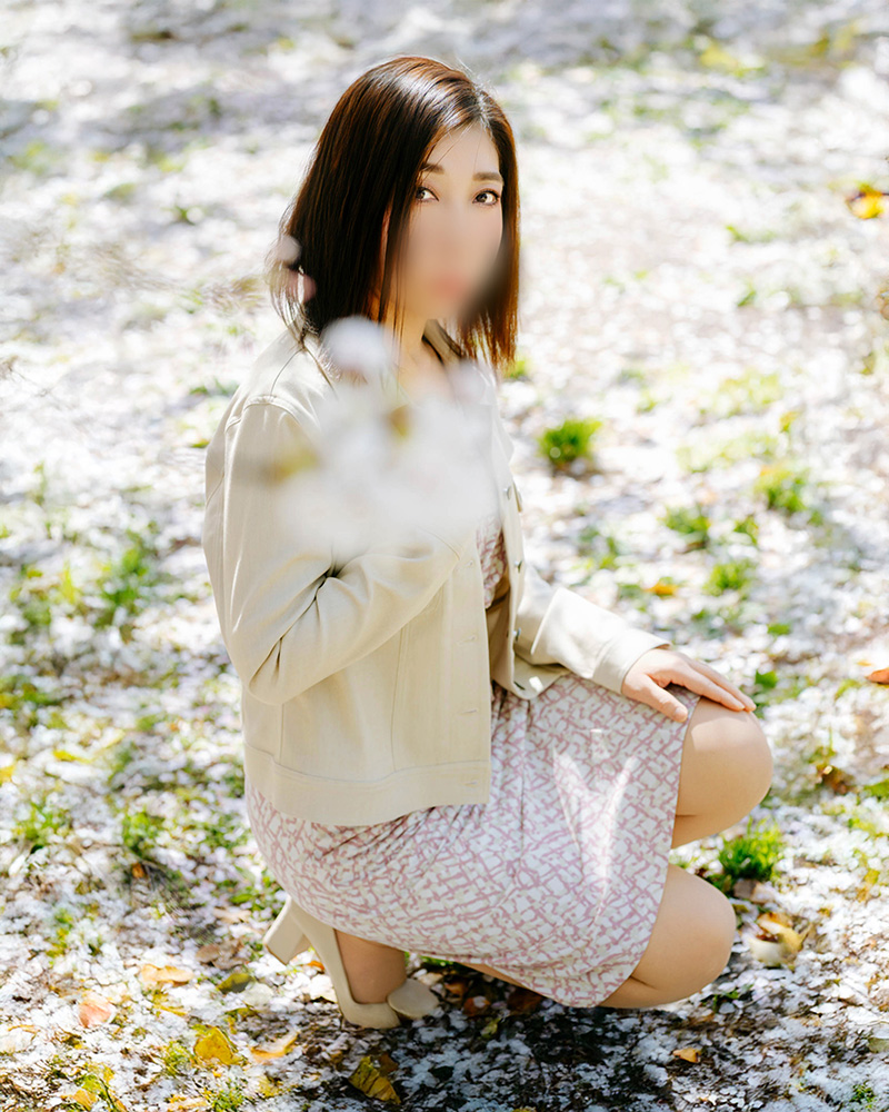 見てください、この柔らかい表情。 地面に敷き詰められた桜の絨毯に、ふわりと降り立ったような美桜さん。 あえて目線を外したり、日常のワンシーンを切り取ったような写真は、見る人に「あ、この人に会ってみたい」という強烈な親近感を与えます。