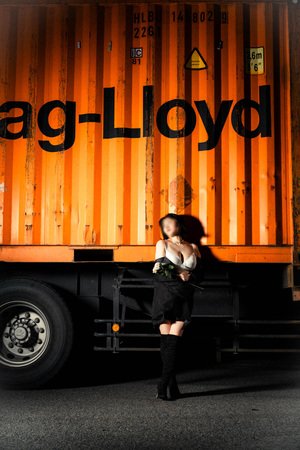 見てください、この圧倒的な存在感。 重厚なオレンジのコンテナを背に、黒のコートとロングブーツで決めた彼女の姿は、まさに「カッコいい大人」そのもの。 夜の闇とドラマチックなライティングが、彼女の持つ「背徳的な魅力」をより一層引き立てています。