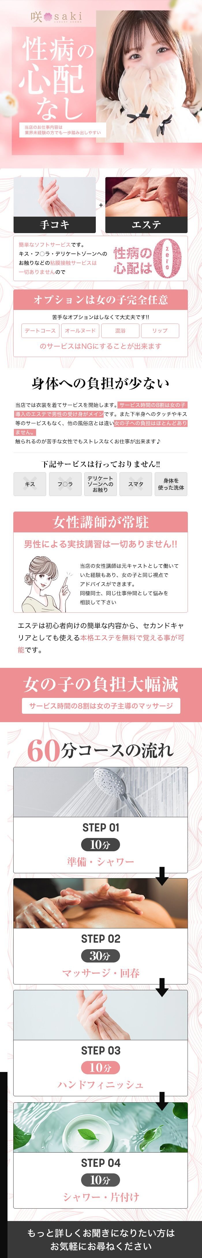 エステで1日10万円可能】1日問い合わせ数100件超え!お客様会員登録数5万人以上!全国屈指の知名度で安定感も抜群で平均収入は1日5万円♪手を使うだけのソフトサービスでキス、フ◯ラ、素股、指入れなど一切ありません!身体への負担が少なく病気の心配もないので安心して働けます♪ お客様から1日100本〜150本以上のお問い合わせを頂いており集客力にも自信があります!他店で稼げなかった方でもぜひご応募下さい♪
