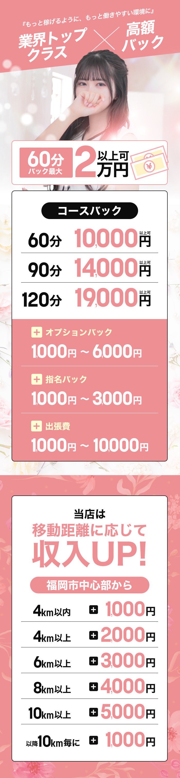 | A | 【Bronze classやGold classなどの女の子がいますがどういった意味でしょうか?】 女の子によってお客様の支払う料金が変わります。サービス内容はそのまま、ランクが上がれば上がるほど女の子の取り分も多くなります。ランクアップの条件はリピート指名数など実力によって決まります。  ̄ ̄ ̄ ̄ ̄ ̄ ̄ ̄ ̄ ̄ ̄ ̄ ̄ ̄ ̄ 【働いてその日にお金はもらえる?】 全額その日にお渡し致します。  ̄ ̄ ̄ ̄ ̄ ̄ ̄ ̄ ̄ ̄ ̄ ̄ ̄ ̄ ̄ 【0で帰る事はありますか?】 0で帰る女の子は滅多にありません。広告費も九州TOPクラスで集客力には自信があります。 |