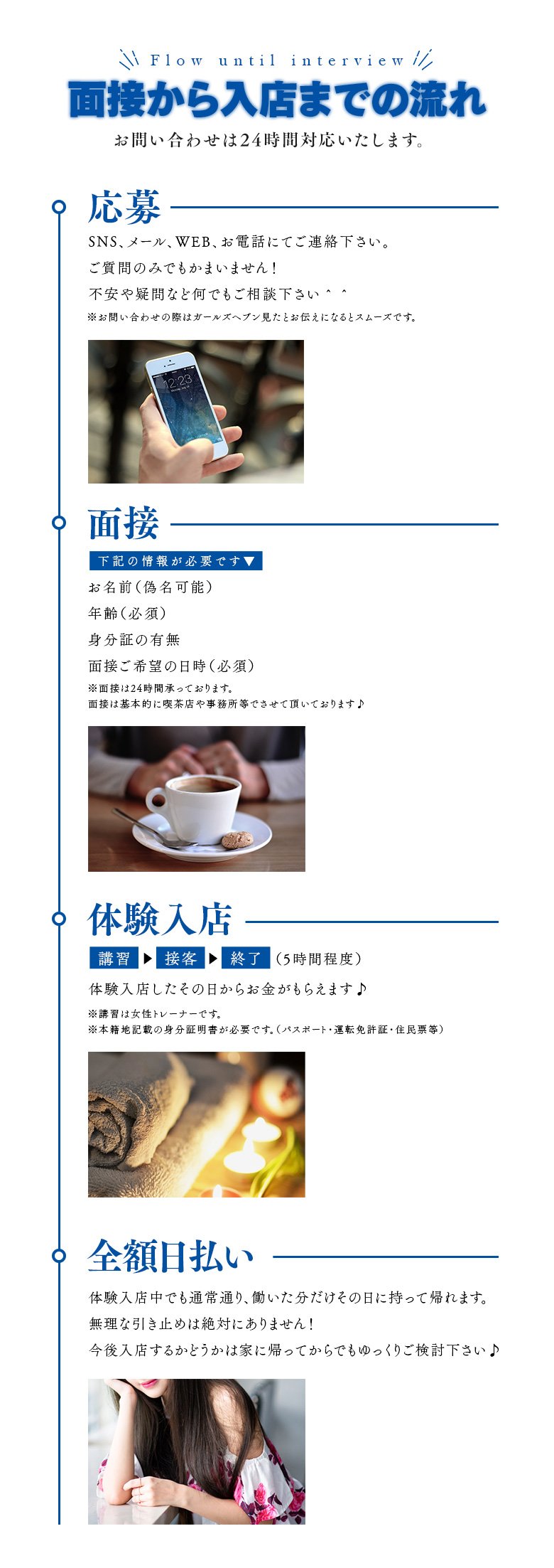 | A | 【面接時間は?】 15分〜30分ほどで終わります。  ̄ ̄ ̄ ̄ ̄ ̄ ̄ ̄ ̄ ̄ ̄ ̄ ̄ ̄ ̄ 【体験入店はできる?】 面接後、体験入店する事が可能です。本籍地入りの住民票(発行より3ヶ月以内の物)運転免許証、住基カードなどが必要となります。  ̄ ̄ ̄ ̄ ̄ ̄ ̄ ̄ ̄ ̄ ̄ ̄ ̄ ̄ ̄ 【タトゥー、傷跡があっても大丈夫?】 ワンポイントであれば問題ありません、範囲が広い場合にはお断りさせて頂く場合もございます。  ̄ ̄ ̄ ̄ ̄ ̄ ̄ ̄ ̄ ̄ ̄ ̄ ̄ ̄ ̄ 【話だけでも大丈夫?】 お話だけで大丈夫です。こちらからしつこく連絡や勧誘をする事は絶対にありません。ゆっくり考えられて決めください。 |