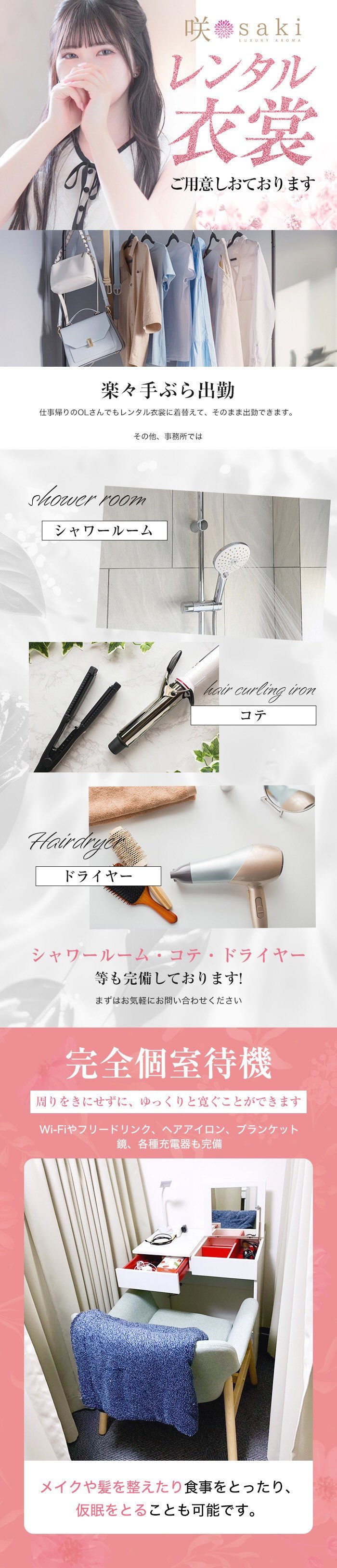| A | 【サービスはどこまである?】 マッサージとハンドサービスのみ、サービス開始は衣装を着てサービスを開始をします。サービスの途中からトップレスになり、最後に手コキをして終了です。時間の8割は女の子主導のエステで男性の受け身がメインです。 また下半身へのタッチやキス等のサービスもなく、他の風俗店とは違い女の子への負担が少なく、触られるのが苦手な女性でもストレスなくお仕事が可能です。  ̄ ̄ ̄ ̄ ̄ ̄ ̄ ̄ ̄ ̄ ̄ ̄ ̄ ̄ ̄ 【接客時の衣装は?】 下着+キャミソールです。衣装についてはお店でご用意します。 |