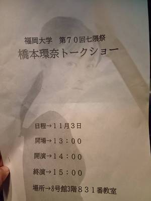 こんばんは!いじちっちです! 人生初の学祭に行って来ました。 ゲストは福岡出身の橋本環奈ちゃん!! 一番後ろの席からでしたが、オーラと可愛いさが溢れており、 学生さんの質問にノリノリに答えて、 ゲーム大会では勝ち残った人に手渡しで サイン色紙と握手付きまでの大サービス。 自分は途中でクイズハズレて早々と離脱しました… 前に博多座で千と千尋の神隠しの 橋本環奈ちゃんのチケット持ってましたが、 コロナにかかってしまい、 やっと橋本環奈ちゃん観れて満足しました。 普通にテンチカ(天神地下街)歩いて買い物してるって話してて、 学生さんビックリされてました。 学祭は屋台出たり、色々なイベントがあり とても楽しめました。 それではまた!