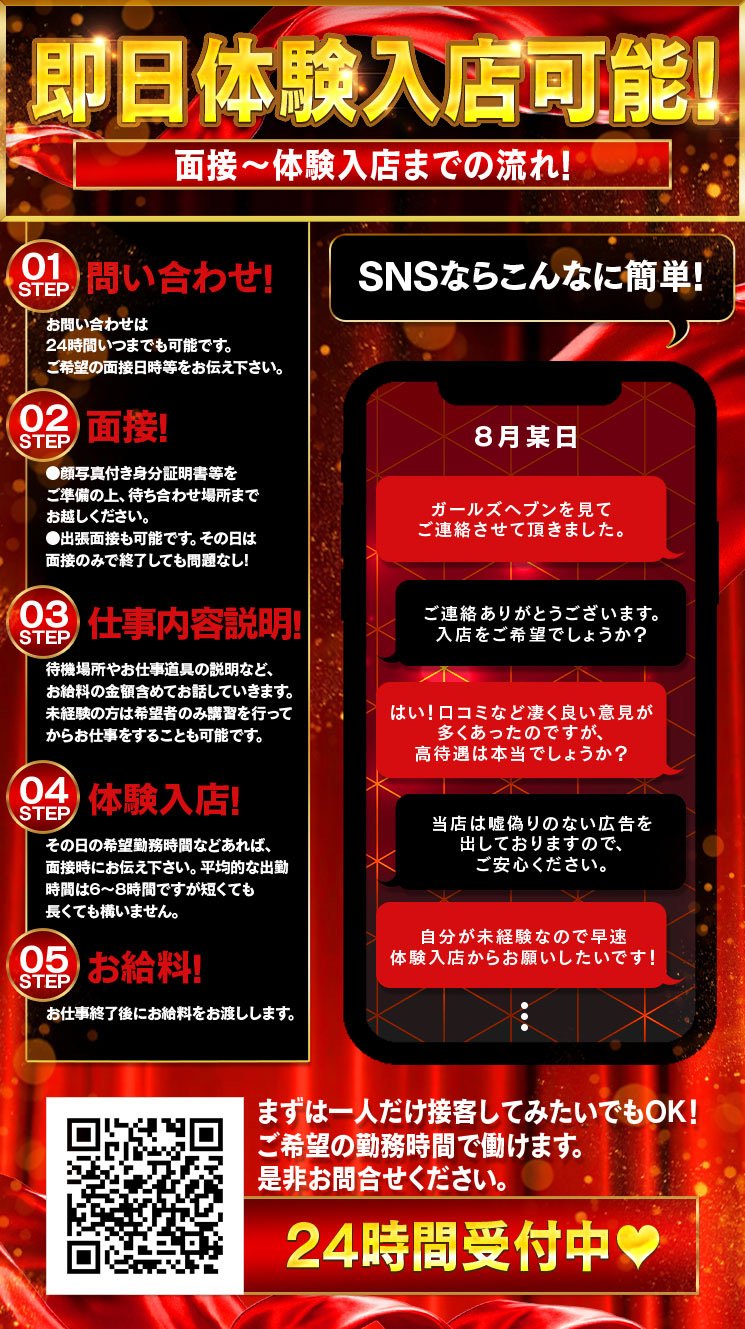 | A | ご希望されれば即日(身分証明書が必要です)でも可能です! お店の雰囲気・お仕事の付きなど知りたい事の方が沢山あると思います。 なので御希望される方は体験入店も可能となっております。 一日体験してみて、「このお店は自分に合いそうだな」と思ったら是非一緒に頑張っていきましょう! ※個人情報は厳守致します。 |