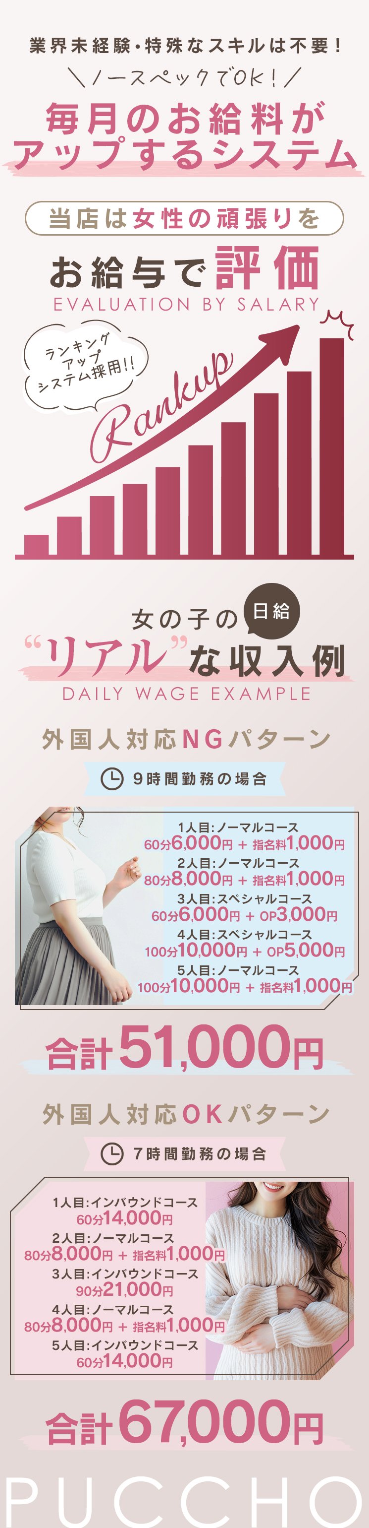 | A | ノーマルコース 60分 6,000円 ↑フリーのお客様はこちらのバックです☆ 指名の場合+1,000円 本指の場合+2,000円 オプション付きのコース 60分9,000円~ インバウンドコース 60分14000円~ さらにさらに(^^)/ ❤️バック増額キャンペーン❤️ ❤️ぽちゃ体型の女の子も体型関係なしに全員60分12,000円バック以上可能 ❤️さらに追加でお給料アップもできます ❤️出勤ボーナス+1,000円 ❤️写メ日記ボーナス+1,000円 ❤️本指名ボーナス+3,000円 ❤️指名ボーナス+1,000円 ❤️出張費ボーナス+1,000円〜 ❤️毎月お給料がアップ❤️ |