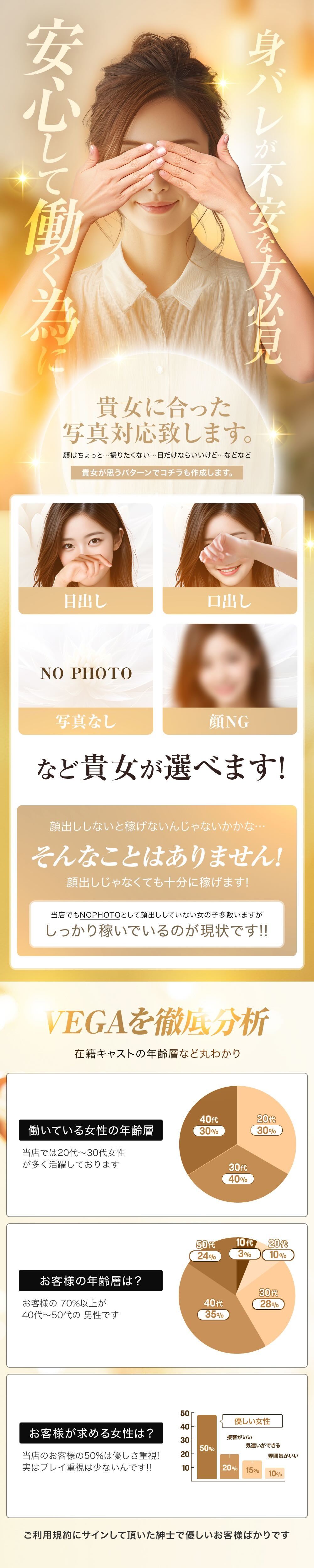 こんにちは!VEGA福田です♪VEGAは20代後半から30代女性を中心とした【風俗エステ】のお店になります!粘膜接触なし、ヘルス行為一切なし!ソフトサービスでもしっかりと稼げるお店と胸を張って言わせていただきます。月100万円以上稼ぐ女の子が毎月出てます♪今一番勢いのあるお店で一緒に稼ぎませんか?お問合わせお待ちしております^^