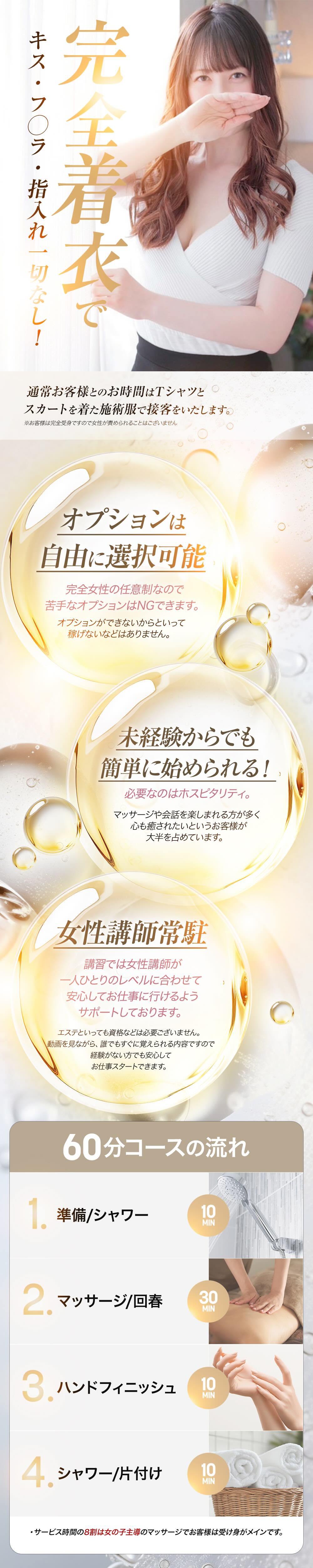 30代を中心とした大人の女性が多数在籍。エステ経験は一切不問♪ 未経験の方も大歓迎です♪当店は脱がない・舐めない・触られない🙅♀️業界未経験でも安心して始められるソフトサービスのみのお店です✨安定した集客力があるので、日給6万円・月収100万円以上も目指せます!