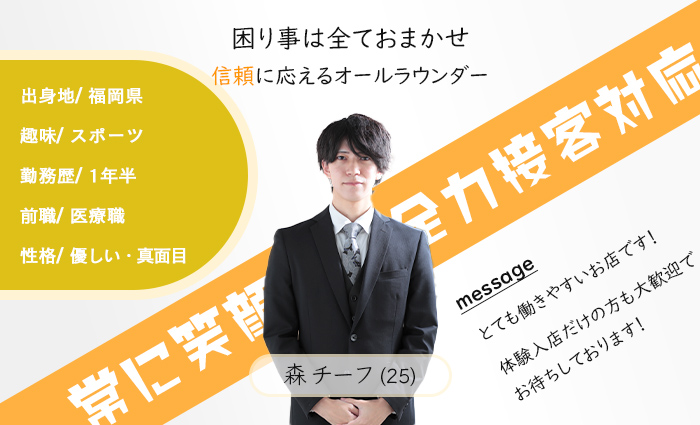 | A | 当店には女性スタッフが常駐しており、優しく丁寧にアドバイスをいたします。高度な接客技術は必要ありません。自分らしく働き、自分らしく稼ぐことができるお店です。分からないことがあれば、スタッフが1から丁寧にご説明いたしますので、安心してお仕事に臨むことができますよ。また、男性には話づらい同性同士の悩みや不安がある場合は、遠慮なく相談してください。スタッフがサポートいたします。 |