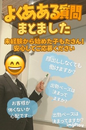 ニックネーム:業界未経験でも安心して始められるソフトサービスなお店です!キス・素股・フ◯ラ・下半身へのお触りなどの粘膜接触は禁止にしておりますので性病の心配は一切ありません。高単価で女の子に負担が少ないので未経験の方にもオススメです♪
