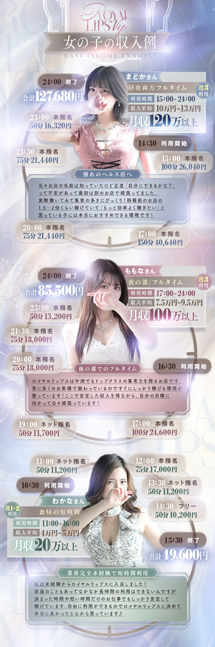 【利用】週2〜4【時間】平均7〜12時間【日給】平均6〜13万円初めての利用の日緊張で手が震えていたのを今でも覚えています。お店のスタッフさんの方々はとても優しく私の不安を和らげてくれました。最初はお客様との会話がうまくできるか心配でしたが少しずつ慣れていきました。今ではスタッフさんのサポートもありしっかり稼げるようになりましたのでロイヤルリップスを選んで良かったと思います!