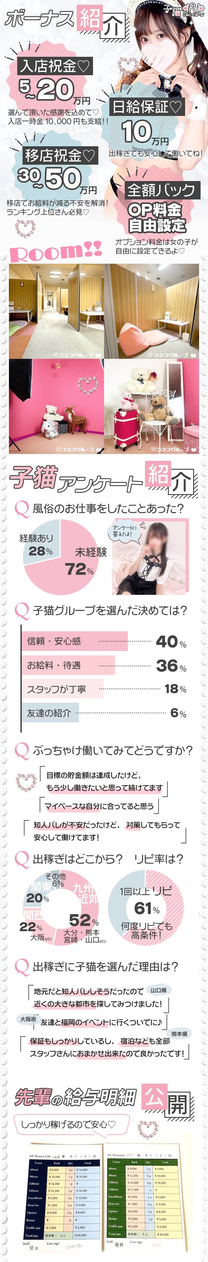 | A | 【子猫GROUP】のお給料日、それは毎日です🍎 要するに、出勤して稼いだお金は全額その日の帰りに持って帰ってもらいます🍎 だから、例え一文無しで出勤してきても帰りはあったかホクホクのセレブ気分です🍎 もしも、そのお金を全部使っちゃっても、次の日に出勤すればまたもあったかホクホクになれるのです🍎 そんなわけでダメ人間にならない注意だけは必要ですね🍎 |