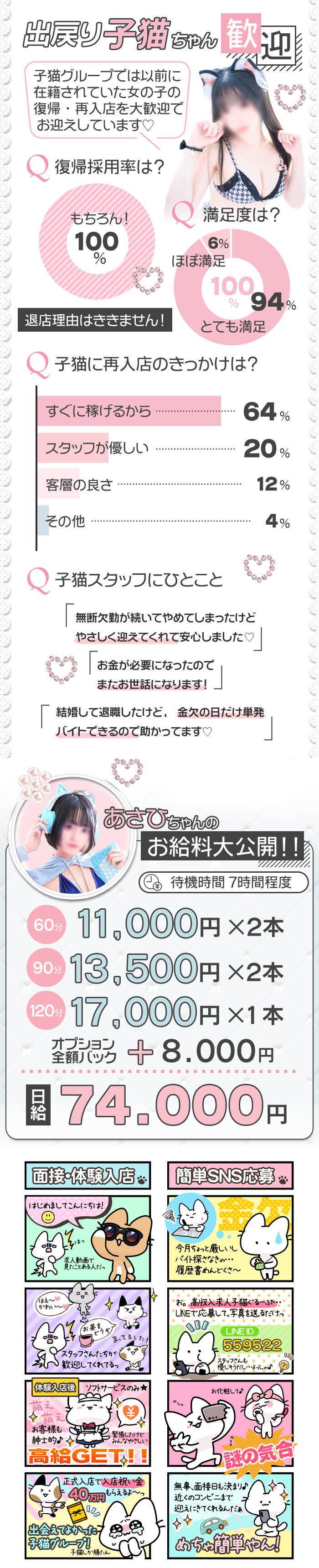 | A | 罰金やノルマなどは一切ありません💖 【子猫GROUP】は完全自由出勤制です💖 自分の都合で、たとえ月に1回の出勤でも大丈夫なんです💖 ただ、自分で決めたスケジュールは守ってくれることが前提です💖 体調不良等の事情があれば別ですが、自分で決めたスケジュールを守らず遅刻や欠勤を繰り返すと予約のお客様にも迷惑をかけることになりお店が予約を受けられなくなってしまうのです💖 そんな場合でも罰金などは発生しませんが、お店が予約を受けられなくなればお給料が減ってしまいます💖 あまりにひどい場合は退店勧告の対象にもなるので、無理なスケジュールは入れないで自分のペースで稼いでください💖 |