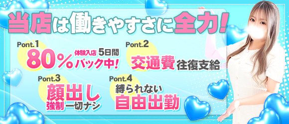 ~完全自由出勤~ ・1日体験入店OK ・週1~勤務OK ・貴方に合った出勤スタイルでOK ※強引な引き止めはしませんのでご安心ください!! |