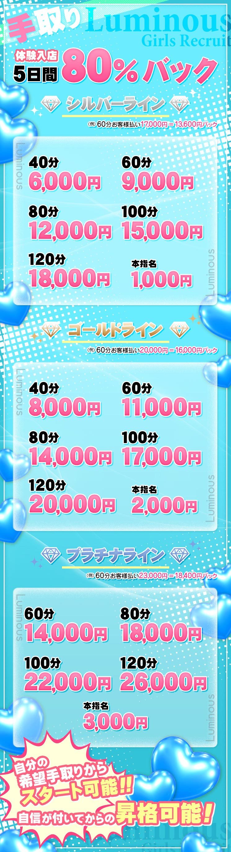 ■朝9時~16時内 ¥35000円以上 ■17時~24時内 ¥50000円以上 【ポイント】 ■ヘルスなのに高手取り ■自分に合うコースで勤務OK ■昇格あり 【シルバーライン】 ■未経験者や接客に自信をつけたい方にオススメ! 40分6000円 60分9000円 80分12000円 100分15000円 120分18000円 本指名料 【ゴールドライン】 ■接客に更なる磨きをかけたい方や今のお店よりもっと稼ぎたい方にオススメ! 40分8000円 60分11000円 80分14000円 100分18000円 120分22000円 本指名料2000円 【プラチナライン】 ■高級店経験者やこの座に相応しい方にオススメ! 60分13000円 80分17000円 100分21000円 120分26000円 本指名料3000円 給与シミュレーションはこちら |