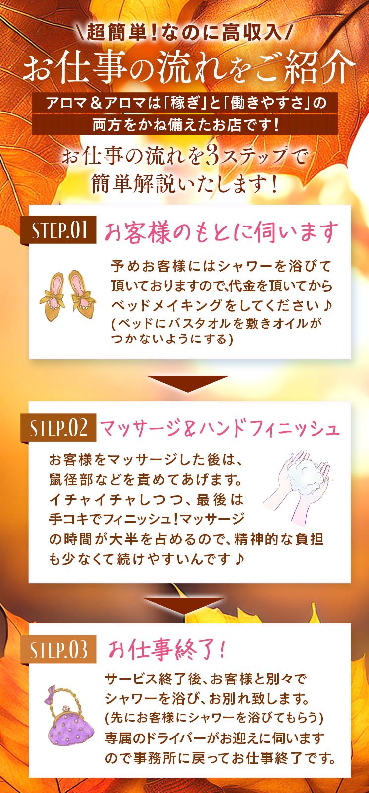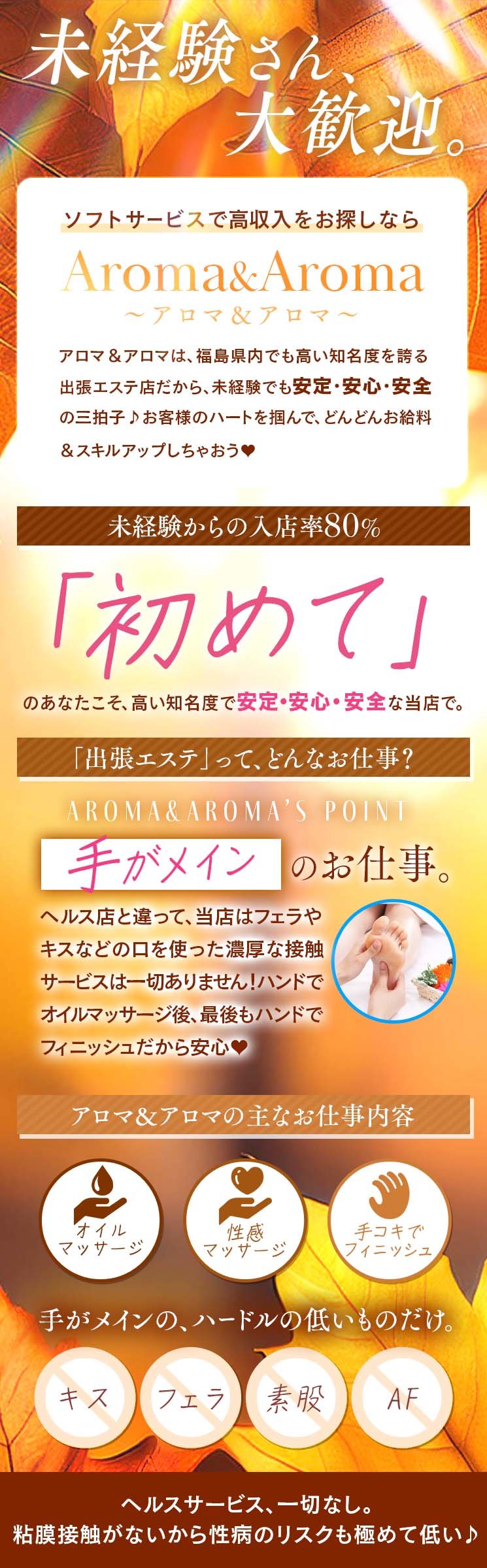 ▼▼▼▼アロマ&アロマの6つの約束▼▼▼▼ ①誇大広告の廃止 ・求人サイトに書いてある内容に偽りがないことをお約束いたします。 ②福島県内で一番有名な出張エステ ・福島県内において、当店より集客のあるエステ店は絶対にないと自負しております。 ③オールヌードなし(他店と違いオプションもありません) ・制服支給で安心。オプションで稼がせる店ではありません。 ④100%性病リスクなし ・キス、フェラなどのデリヘル業務はありません。 手だけでのお仕事になります。 ⑤セクハラ講習なし ・講習は現役女性エステティシャンによる講習。 または、DVD講習になっております。 ⑥退店時に無駄な引き留めなし ・卒業後も連絡がくる・・・。なんて話は耳にしますが、 当店は引き留めや連絡は一切行いません。 --------------------------- 【当店のこだわりポイント】 ●交通費支給 ● 車送迎 ●制服貸与 ●託児所のご紹介 ●駐車場あり ●寮完備 ●掛け持ちOK ●自宅・個室待機可 ●自由出勤 ●体験入店可能 ●短期OK ●未経験歓迎 ●ノルマなし ●ボーナスあり ●アリバイ対策万全 ●出張面接可能 ● 衛生対策あり ●生理休暇 ●日払い可能 ●未経験者・経験者大歓迎 |