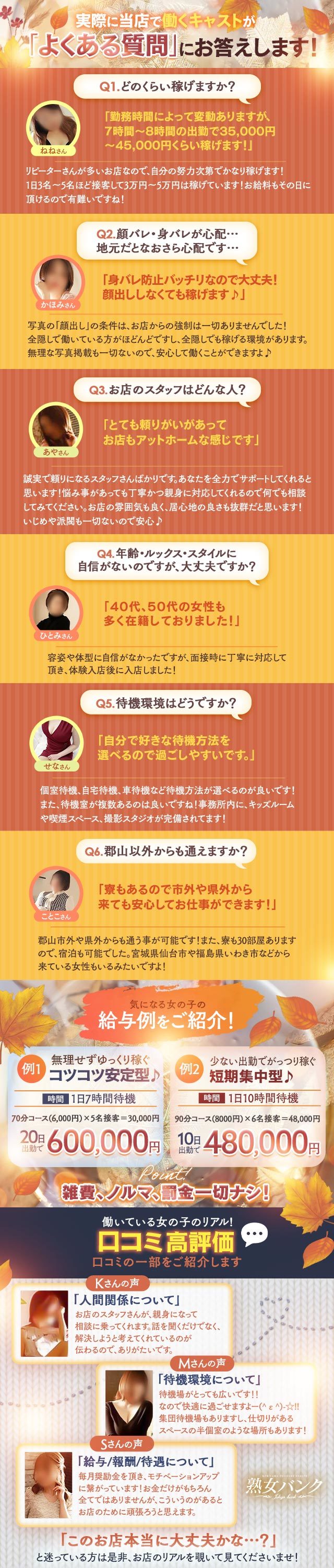 ※全額完全日払い ※雑費、ノルマ、罰金一切ナシ ※郡山市外の場合交通費支給 ★キャスト給与★ 《パネル指名》 ◆70分 :最低6,000円~10,000円 ◆90分 :最低8,000円~12,000円 ◆120分:最低11,000円~15,000円 ◆180分:最低17,000円~21,000円 《本指名》 ◆70分 :最低7,000円~11,000円 ◆90分 :最低9,000円~13,000円 ◆120分:最低12,000円~16,000円 ◆180分:最低18,000円~22,000円 +αボーナス制度 ・口コミ一件投稿 500円 ・本指名率バック 1,000円〜 ・新人期間中の安心保証 ・写メ日記、オキニトーク、キテネなどのコンテンツ活用 10,000円〜 上記ボーナス制度は全キャスト様対応です。 ※お給料から引かれるものはありません。 ※本指名本数に応じて給与スライド ★オプション★ 基本フルバック ★定期健診制度もあります★ ★遠方交通費支給有り★ 給与シミュレーションはこちら |