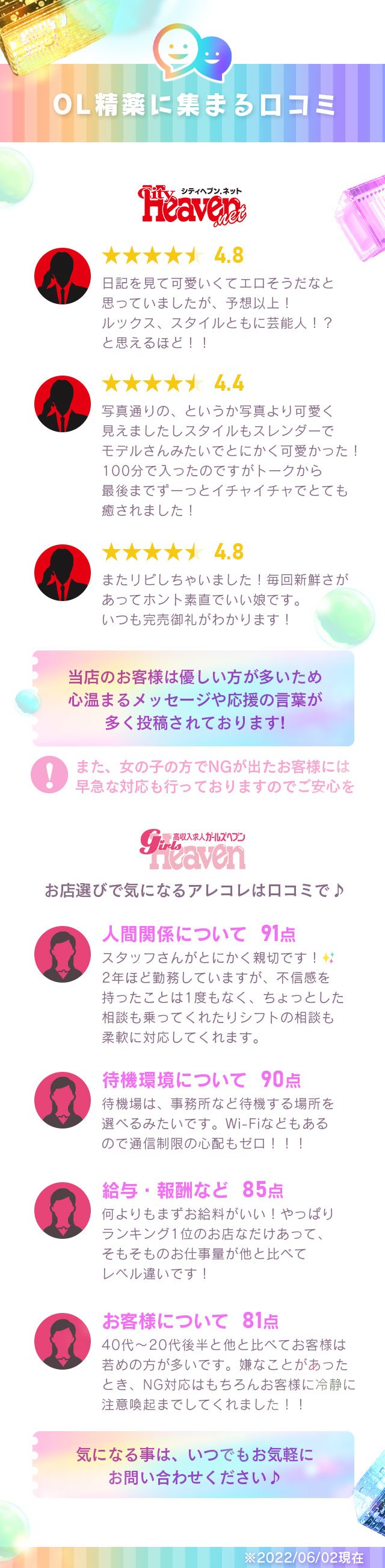 シティヘブンネットに掲載されている各ジャンルの店舗の中からユーザーの人気度・口コミ評価・注目度の高い女性キャストの在籍など、総合的なユーザー評価に基づき店舗を点数化し厳正なる審査を行っております。