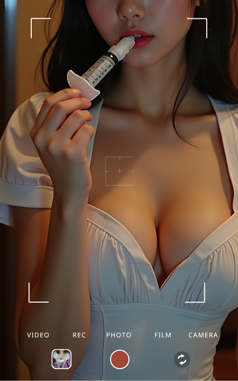 撮り方:ナース服で、注射器のおもちゃを唇に当てる。