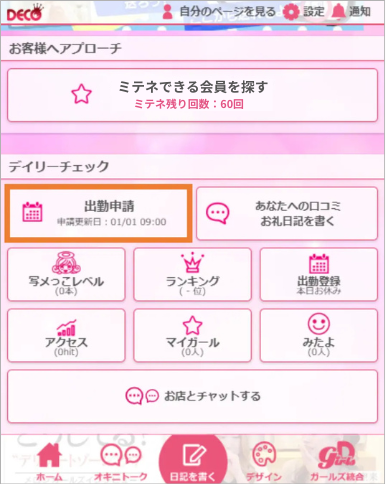 姫デコの出勤申請は、女の子が自分の予定をお店に伝える便利な機能です。