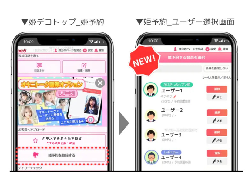 お客さんからの予約を、女の子自身で姫デコから入れられる機能のこと!