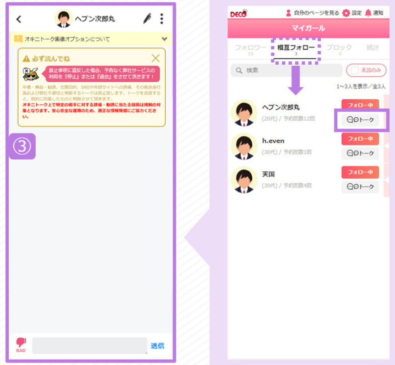 [相互フォロー]ページの[トーク]からもトークページへ遷移できます
