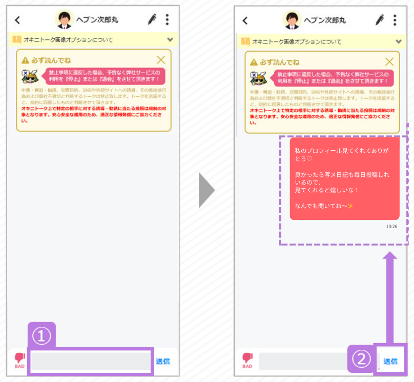 ①専用トーク画面でメッセージを入力