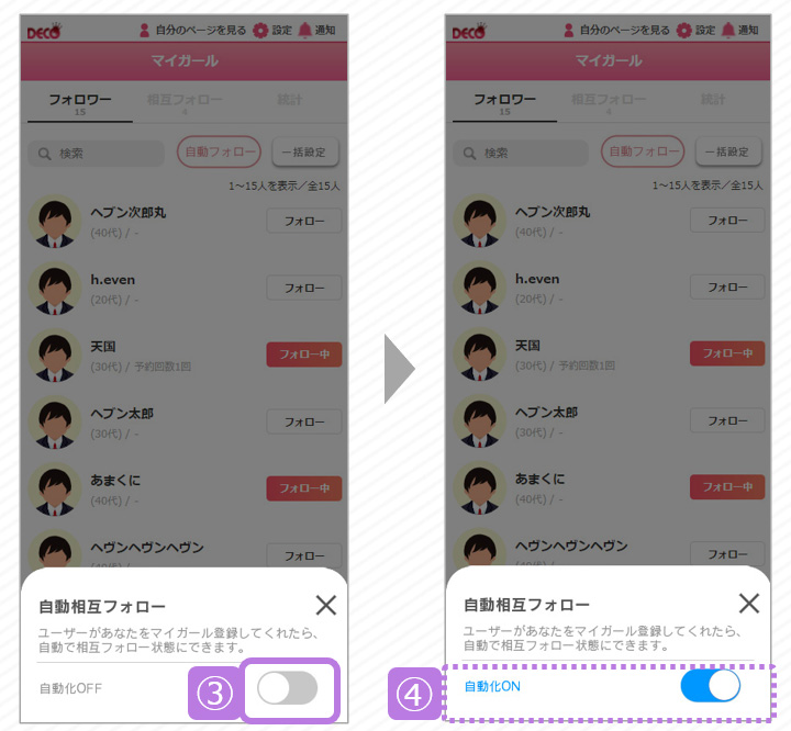 ・自動相互フォローをONにした以降にマイガール登録されたユーザーのみ対象