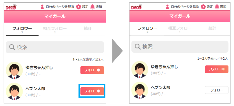ユーザーがあなたをマイガール登録すると、自動で相互フォロー状態になる機能