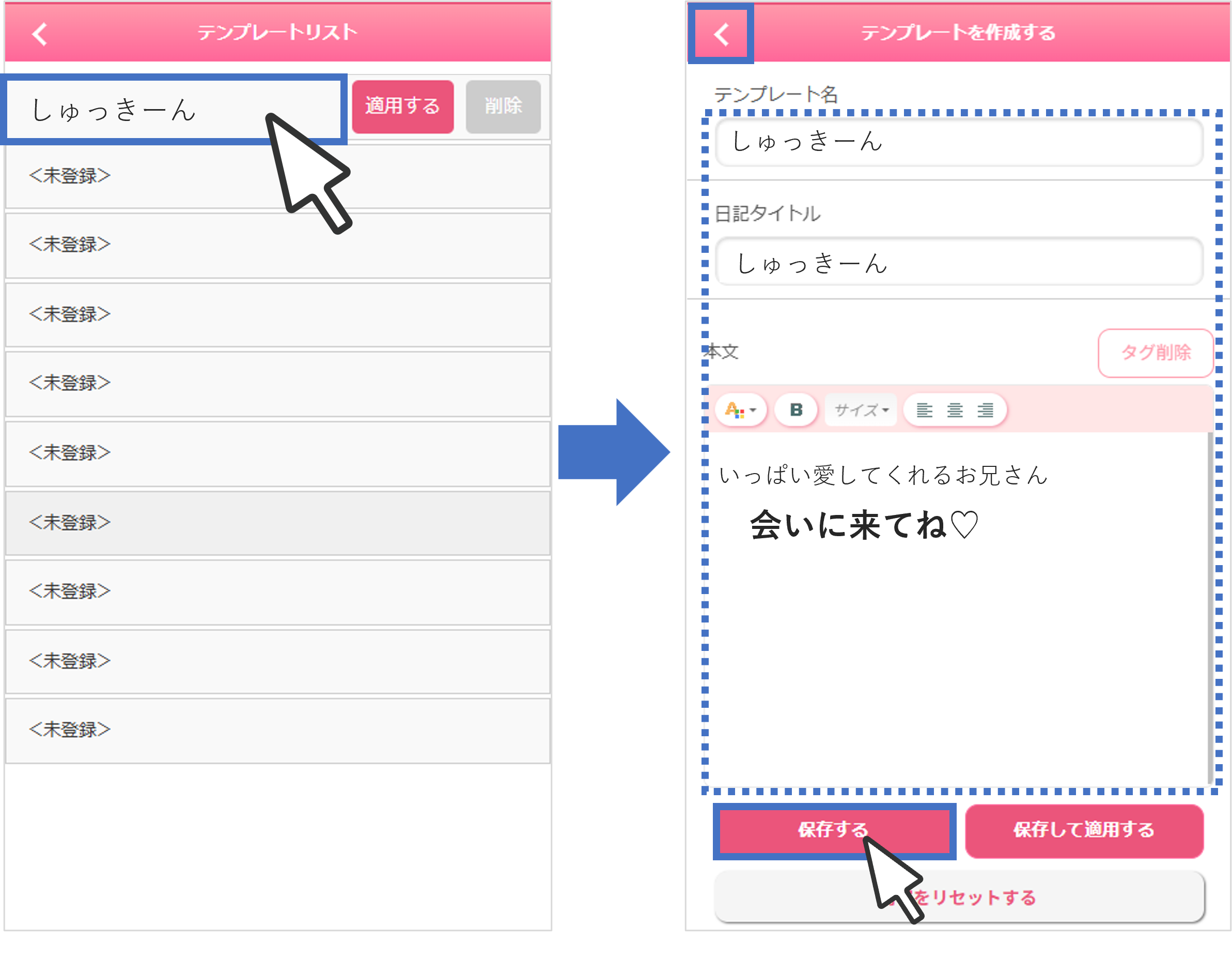 テンプレート名、日記タイトル、本文を入力後、左下の[保存する]を押すことで登録できます。(右下の[保存して適用する]を押すと、保存とともに写メ日記投稿画面へ反映)