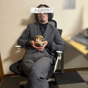 写真はだるまを抱きかかえて癒されてるよしおさんです(ノД`)・゜・。