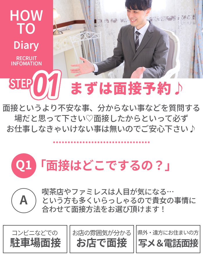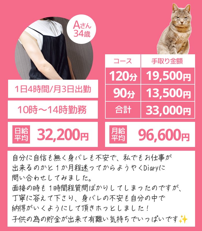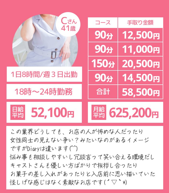diaryの良い所は一番は「人がイイところ」です♪客層も落ち着いた方が多く優しい人が多いです!短時間出勤でも稼がせていただいてます!人間関係に恵まれているお店かと思います。個々のライフスタイルに合わせて提案やアドバイスもくれるので働きやすいです!一緒に目標を持って行動してくれるのが嬉しいです。身バレ対応にもしっかり対応してくれます。店長さんの人柄も良く業界未経験さんにもおすすめなお店です^-^