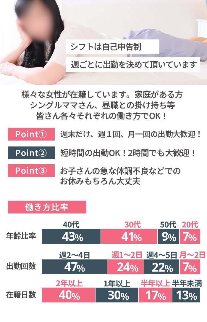 A | 当店では昼職や家庭の空いてる「スキマ時間」などを 活用して出勤するキャストさんも多くいらっしゃいますよ。 「急遽時間できたから、今日出勤していいですか」 「当日にならないと出勤がわからない」 そんな方でも全然大丈夫です。 過度な出勤のお願いなども一切ありません! |