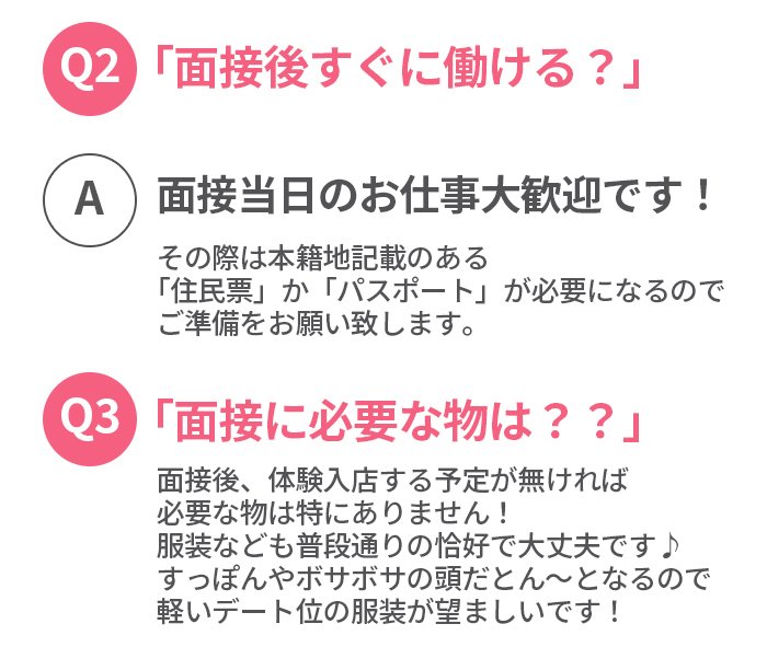 A | すぐに体験ご希望と言う事ですと以下の物が必要となってきますのでご確認ください。 ・身分証明書(免許証などお顔付きのもの) ・住民票 また、お写真撮影可能な方につきましては、お仕事用のお洋服もご持参いただけますと幸いです! もし、万が一無い場合につきましては、お店からの貸し出しも可能ではございますがサイズがそれぞれ違いますのでご用意できる場合はお願いしておりますm(__)m ※お仕事で使う道具等はお店で支給させて頂いておりますのでご安心ください♪ |