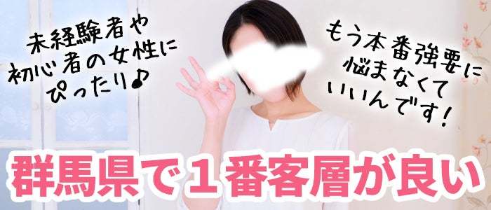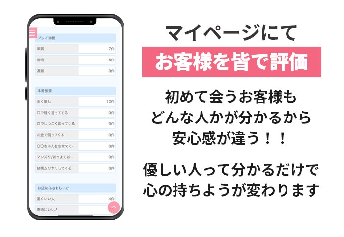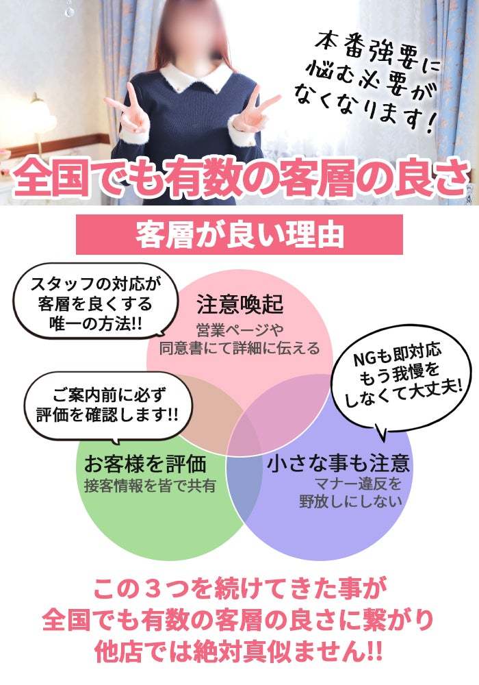 他店から来て下さる女性は必ずと言っていい程「お客様が皆さん優しい人ばかり」を口を揃えて言って下さいます!例えば女性から「さっきのお客様、マナーがちょっと…」といった場合には、即時お客様に伝えて次回ご利用時には改善をして頂くように促していますし、改善がみられない場合にはお店NGの処置をすぐにとらせて頂いています。この積み重ねが優良客層に繋がっている事になります!