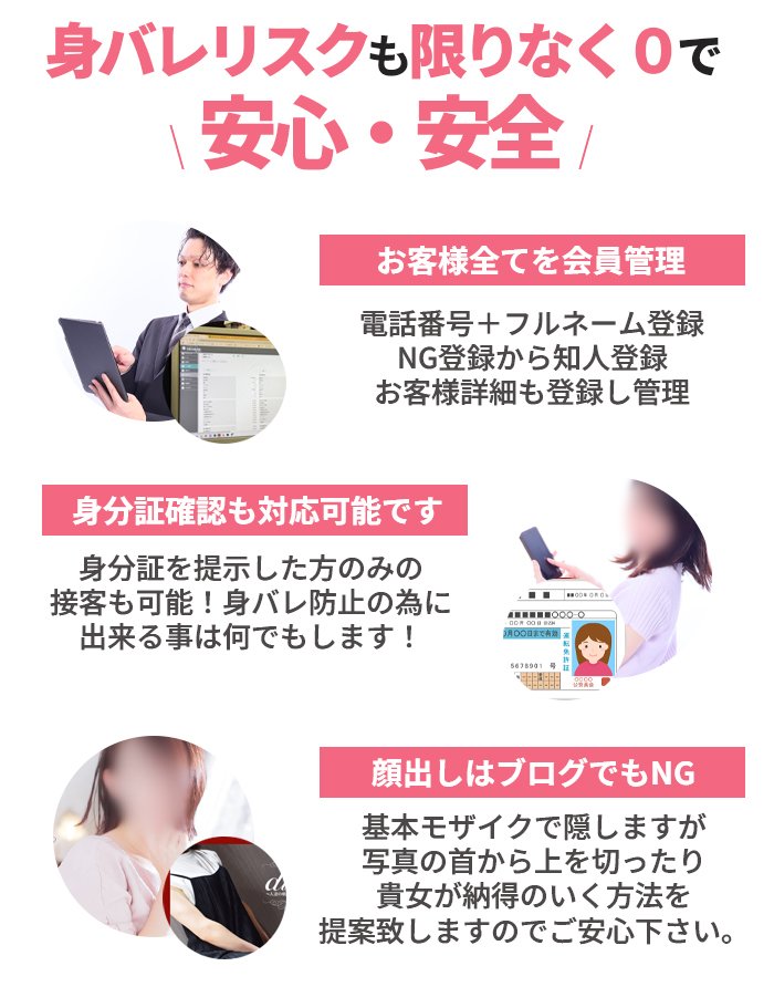 A | 当店ではキャストさんのプライバシーは徹底してお守りします! 在籍されているキャストさんの中でも首からしたの写真を掲載したりする パターンも全然可能ですよ(*'▽') 顔写真(モザイク入れ)がなくても、貴女が活用できるツールなどを 駆使していただけば稼げます。 その為に行う事などはスタッフが全力でお伝えさせて頂きます。 |