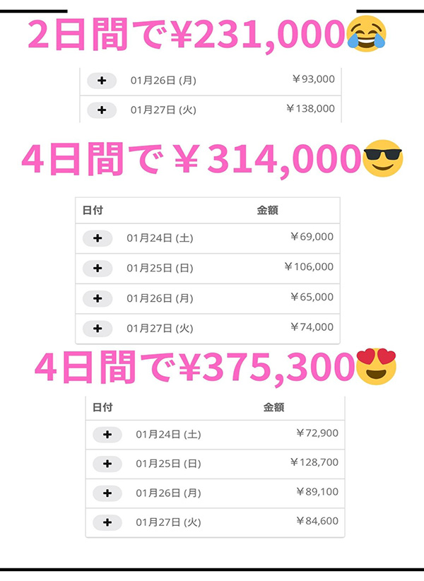 | 東京/23歳・キャバクラ勤務 | 2日間 | ¥231,000 |
