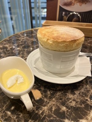スフレにカスタードソース、生クリーム掛けを楽しんでいます