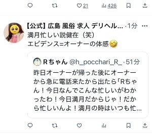 〜昨日オーナーが帰った後にオーナーから急に電話来たから出たら「Rちゃん!今日なんでこんな忙しいがわかったわ!今日満月だからじゃ!だから忙しいんよ!満月の時はいつも忙しいんよ!」って言われて、笑いました😄笑