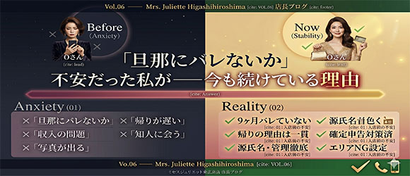 「最初は本当に怖かったです。既婚者なのに、こういう仕事をしていいのかって。でも面接に来て、スタッフの方たちと話したら、みんな普通のお母さん・奥さんで。特別な人たちじゃないんだって分かって、一気に安心しました。」