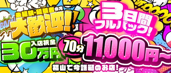 【年齢】18歳~50歳くらいまでの女性の方 《当店の特徴》 ①短時間でも高収入(福山エリアで最高峰の回転率) ②オプション代は全額バック ③福山市内でも交通費支給 ④法人企業による運営で安心 ⑤各法的書類が準備できます ⑥託児所補助あり(託児所代半額負担いたします) ※待機保証制度あります(時給1,000円~) 【待機保証制度】 8時間待機 8,000円 10時間待機 10,000円 12時間待機 12,000円 14時間待機 14,000円 ※新人期間の1ヶ月間は必ず保証いたします(^O^)/ ★入店祝い30万円★ ※入店から3日間全額フルバック致します! ・出勤強制なし ・週1回、1日3時間でもOK ・自宅待機OK ・託児所半額支給 ・完全日払制 ・交通費支給 ・個室マンション即入居可 ・保証制度有り ・マイカー通勤可能 ・写メール面接あり ・入店祝い金あり |