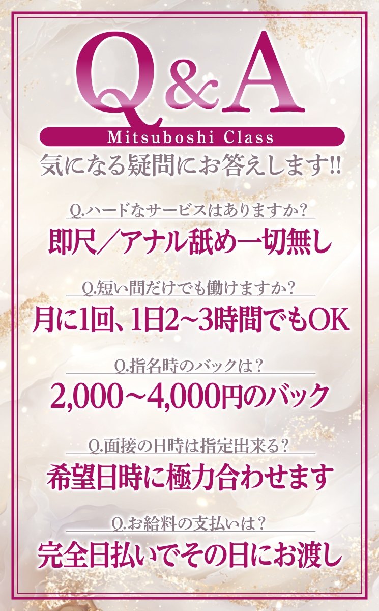 | A | 即日から体験も入店もどちらも大丈夫です。 面接だけでも構いません。 途中でやっぱり辞めようかなぁ… (遠慮なく言ってください) |
