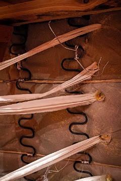 写真は、ソファーのスプリングが切れてしまったので、自分で修理している最中の様子です。ワイヤーを買ってきて、何重にも編み込むようにして強度をアップさせました。
