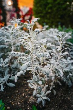 シロタエギクは、葉っぱ全体が白い“粉”をまとったような独特の質感で、雪が積もったみたいに見える植物。