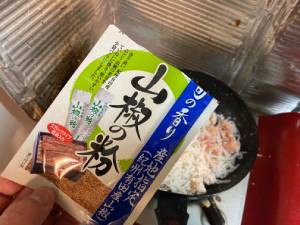 山椒をふりかけ、たらこの色が変わるまでほぐしながら炒める
