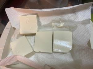 お豆腐を一口大に切りキッチンペーパーで水気を取り除きます