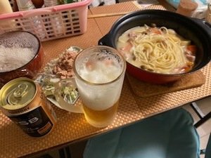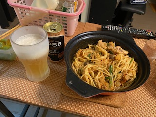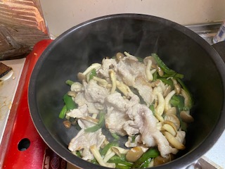 そこに、別で痛めたピーマン、豚小間切れを入れます